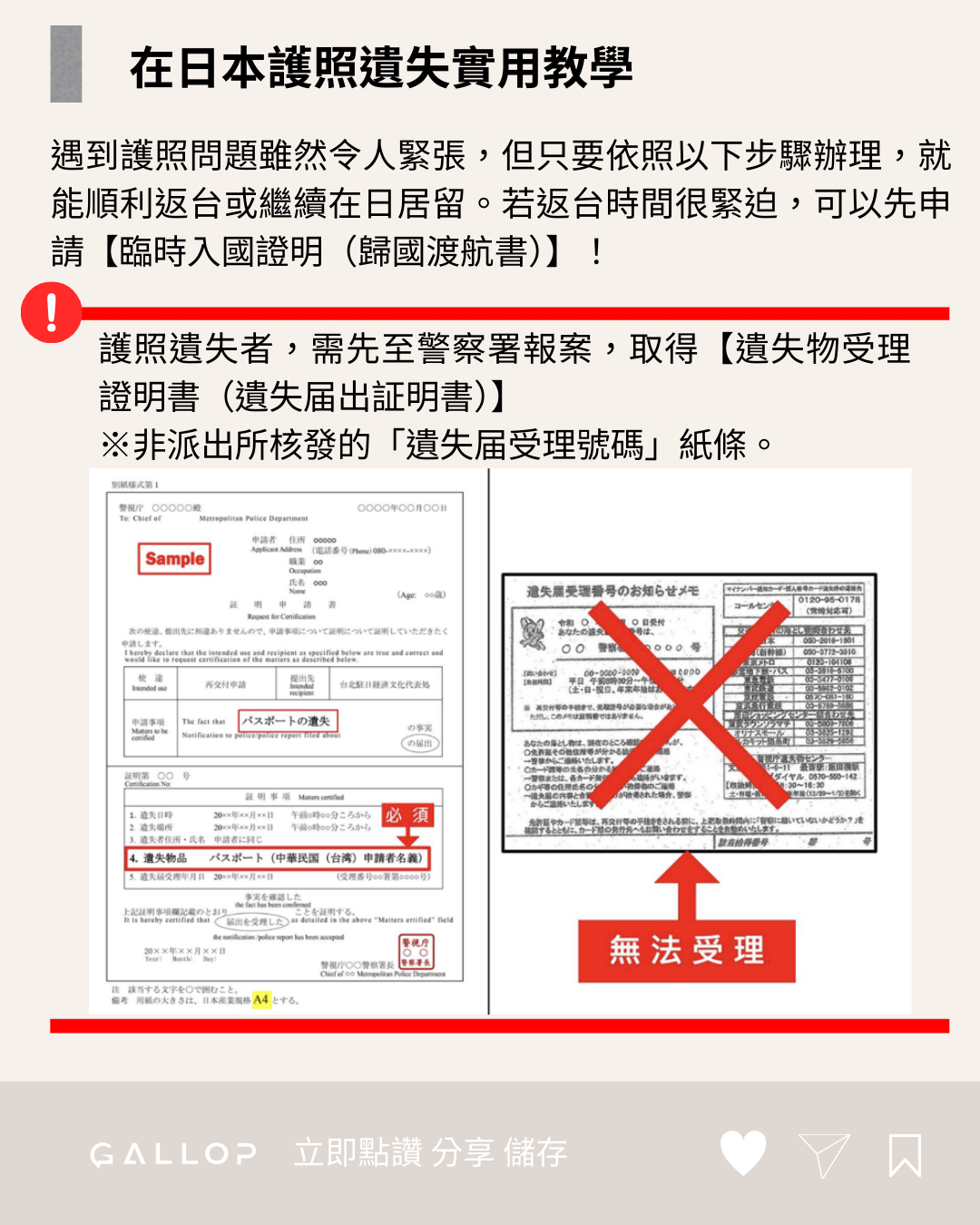 ⚠️護照遺失者,需先至警察署報案,取得【遺失物受理證明書(遺失届出証明書)】※注意:不是一般派出所核發的「遺失届受理號碼」紙條。