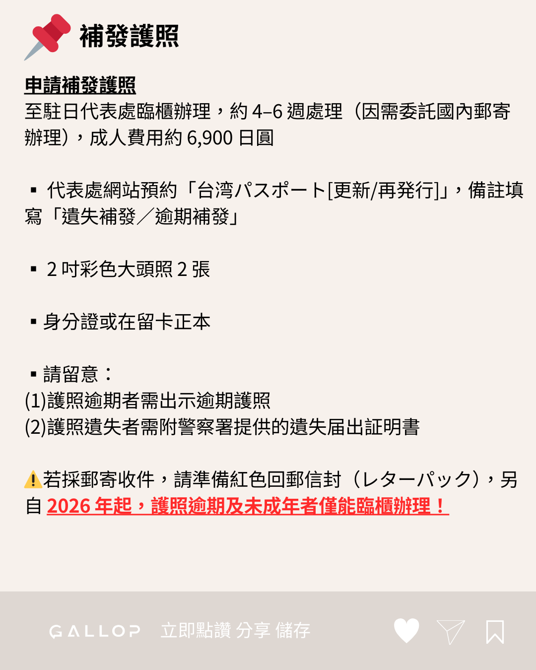 ⚠️若採郵寄收件,請準備紅色回郵信封(レターパック),另 2026 年起,護照逾期及未成年者僅能臨櫃辦理!!