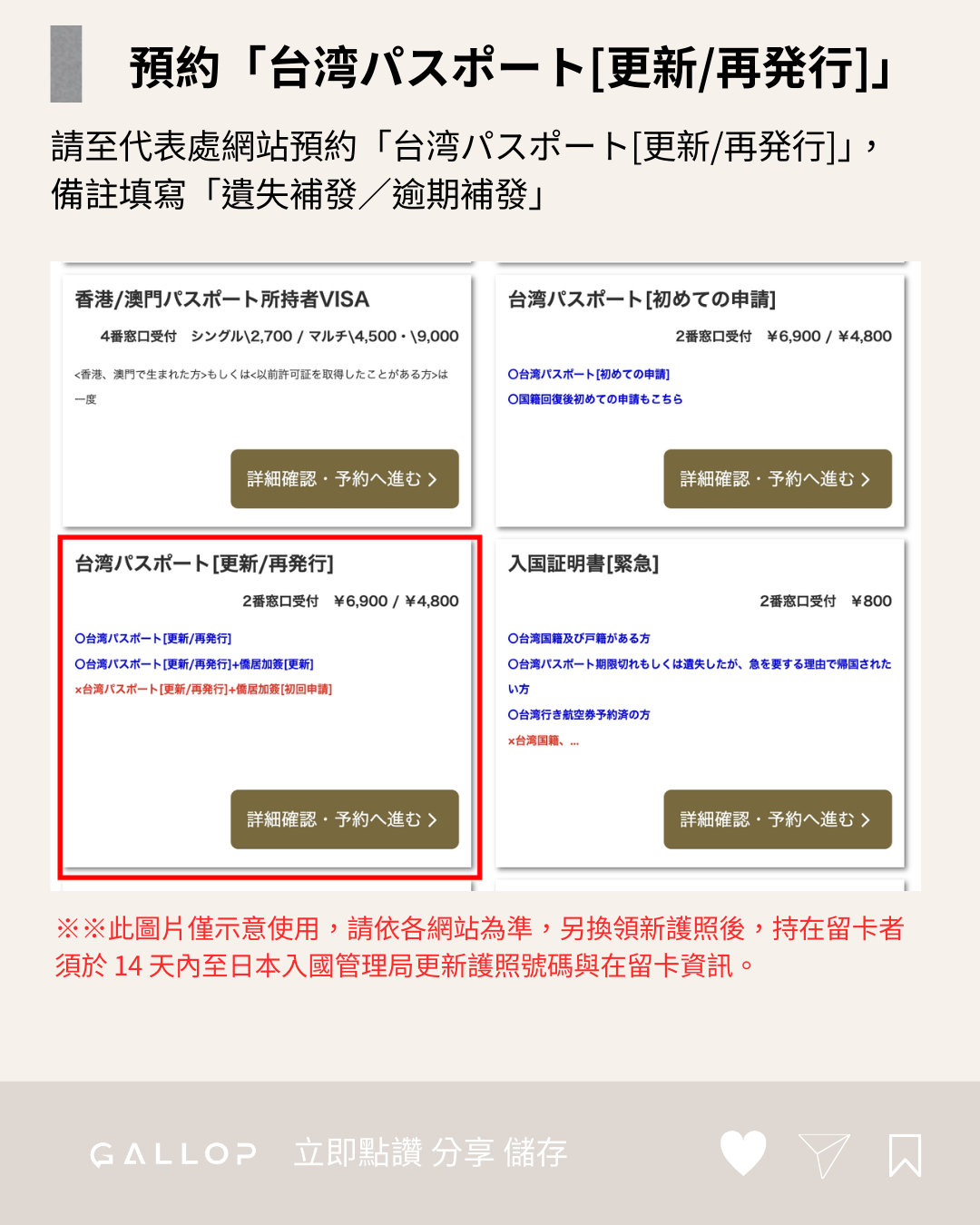 ▪︎ 代表處網站預約「台湾パスポート[更新/再発行]」,備註填寫「遺失補發/逾期補發」