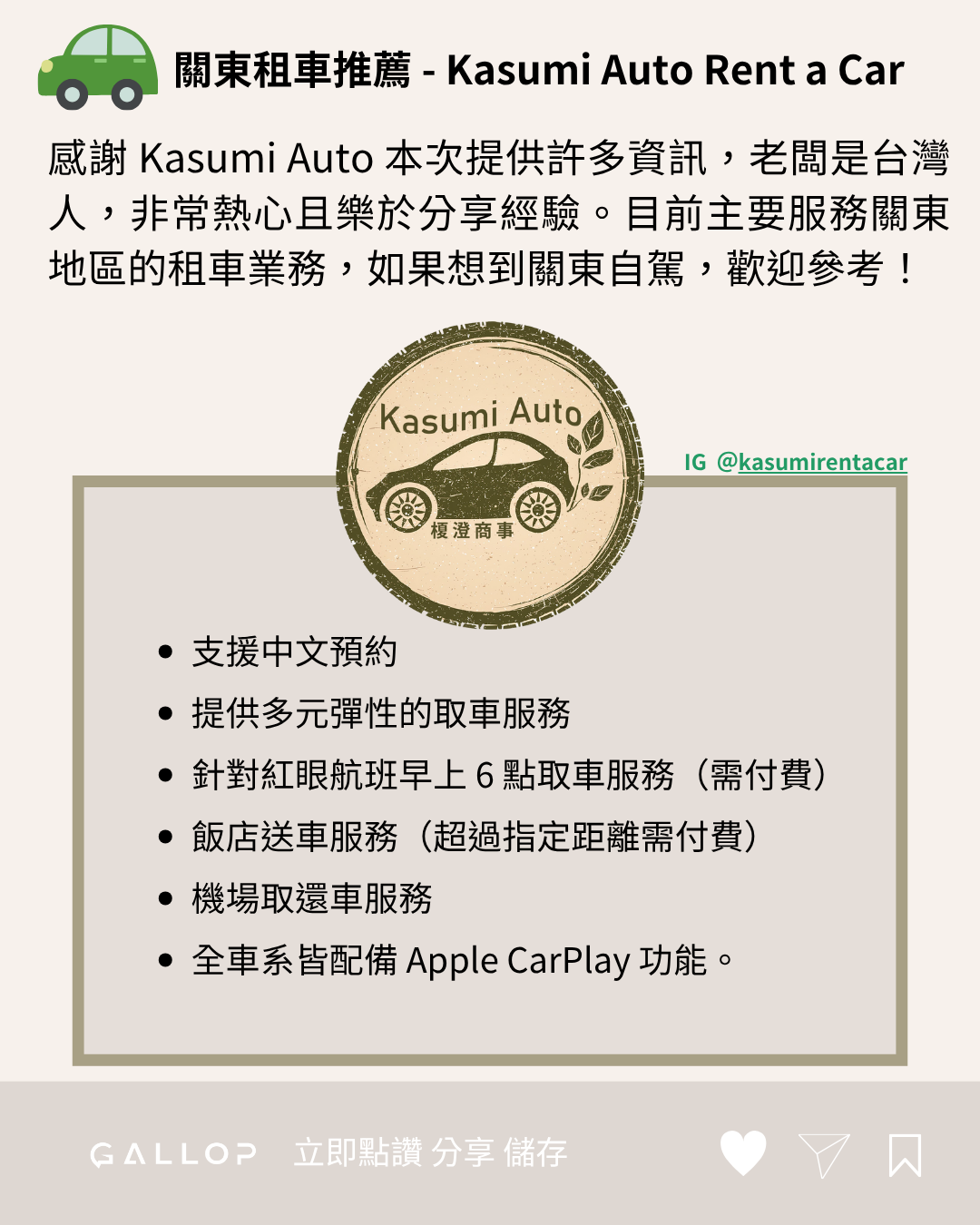 感謝 Kasumi Auto 本次提供許多資訊,老闆是台灣人,非常熱心且樂於分享經驗。目前主要服務關東地區的租車業務,如果想到關東自駕,歡迎參考!