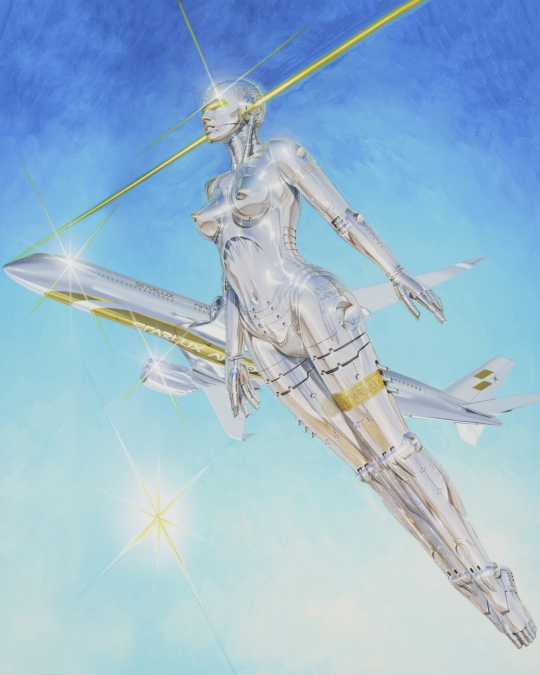 星宇航空 @starluxairlines 攜手空山基(@hajimesorayamaofficial),耗時三年打造全球首架 「AIRSORAYAMA」,以「突破框架、做沒人做過的事」為共同信念,空山基親自繪製核心視覺,將其代表作 機械姬(Sexy Robot) 與航機結合,融入星宇航空的「北極星」意象,讓金屬美學在雲端折射出極具張力的立體光影。