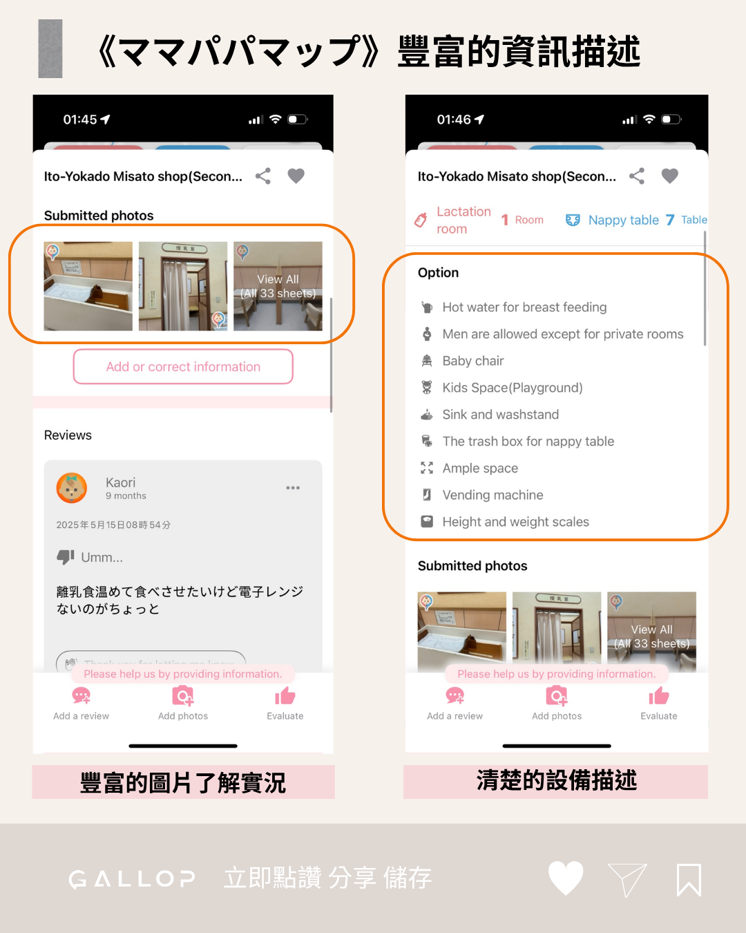 一鍵查詢全日本的哺乳室、尿布台設施,還能看設施實拍照片、其他家長的評價,讓育兒日常更安心、更有效率!