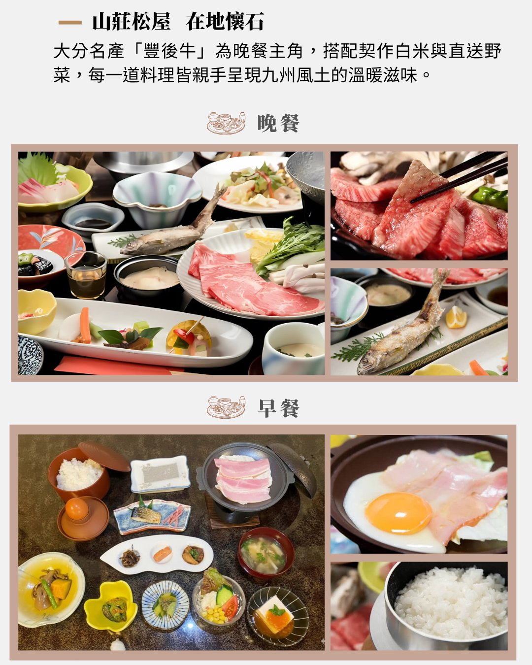 晚餐的懷石料理中,可以品嚐到大分名產「豐後牛」,搭配契作白米與直送野菜,早晚餐從前菜到甜點都能享受到親手製作九州風土的溫暖滋味。