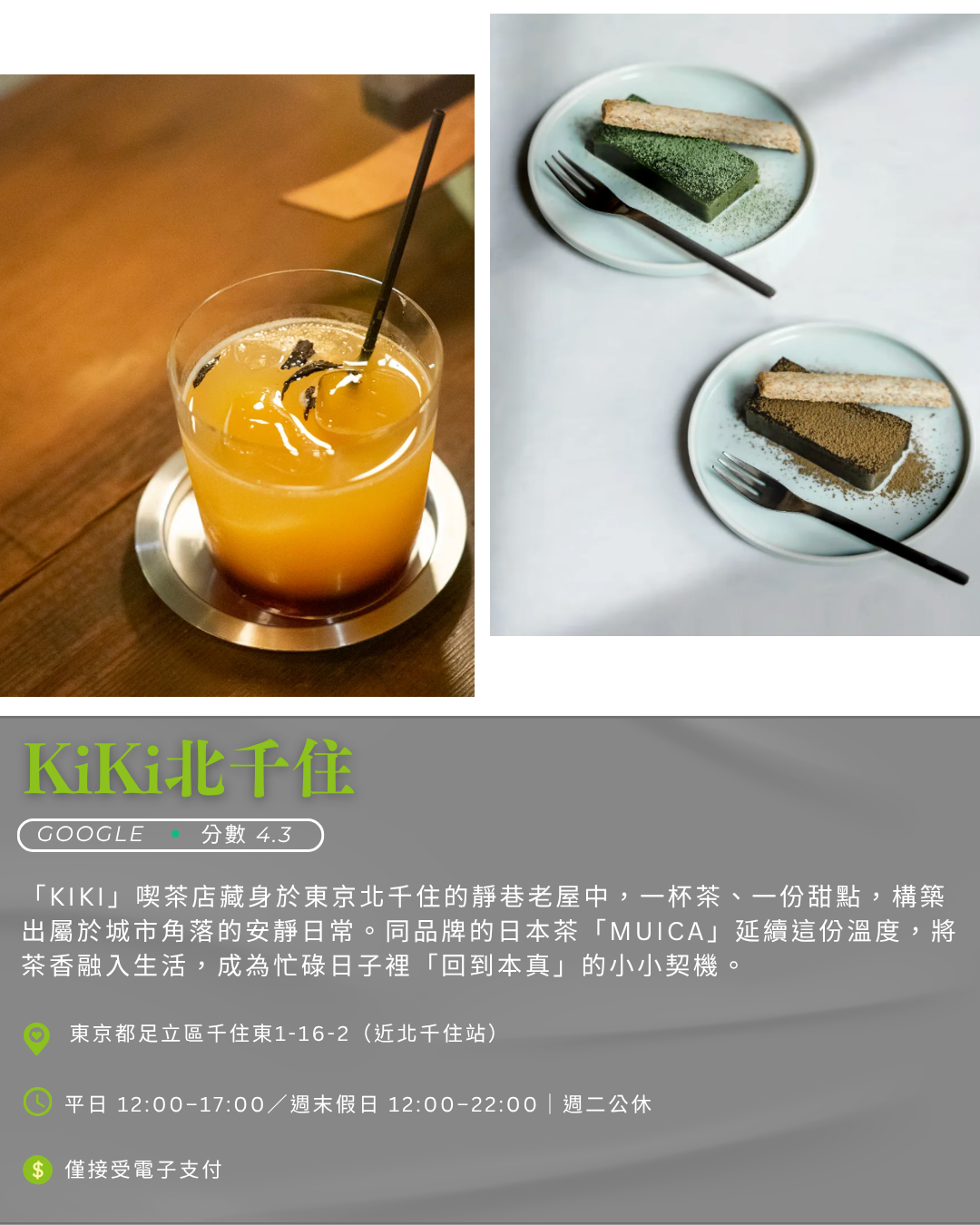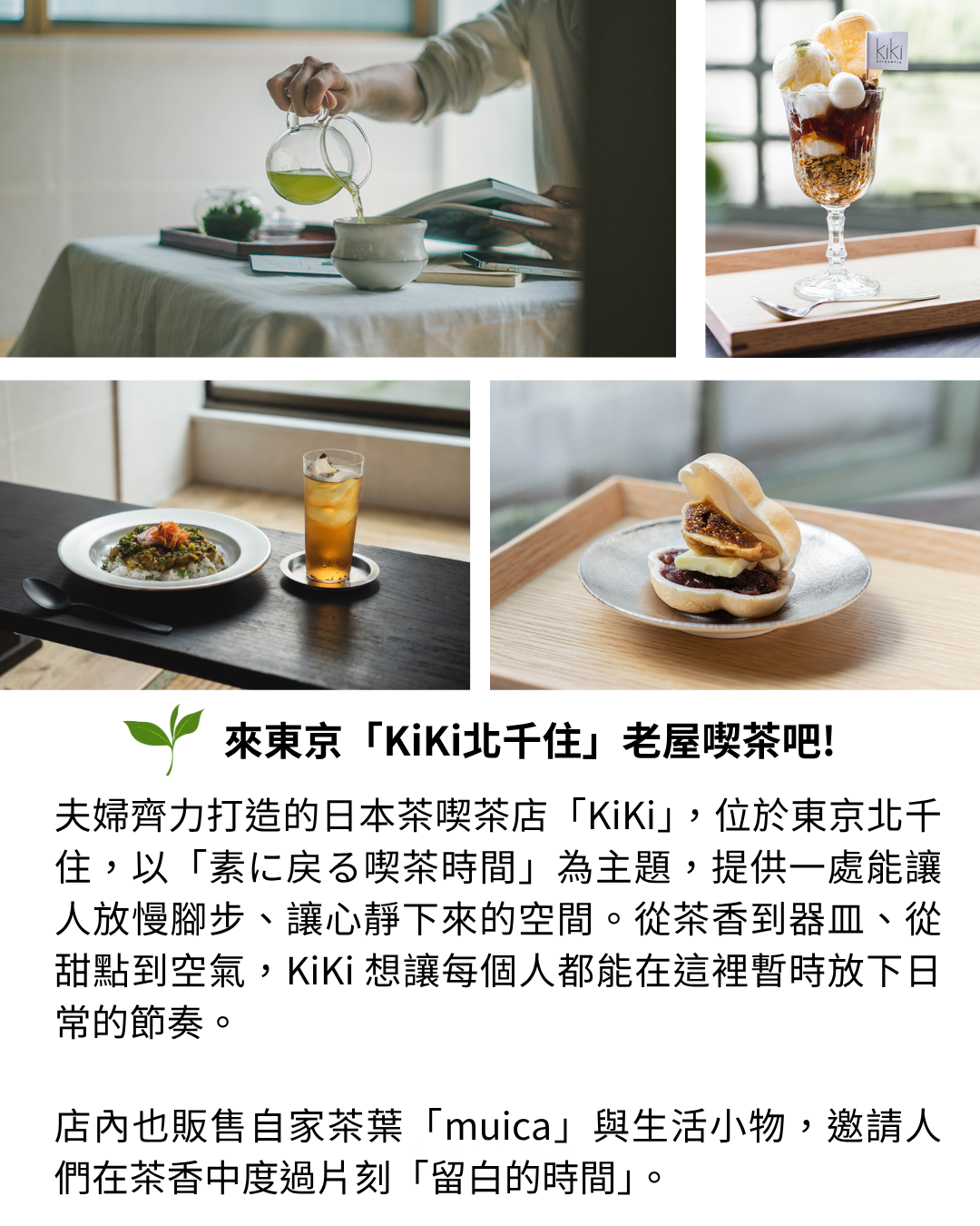 夫婦倆齊力打造的日本茶喫茶店「KiKi北千住」,以「素に戻る喫茶時間」為主題,提供一處能讓人放慢腳步、讓心靜下來的空間。從茶香到器皿、從甜點到空氣,想讓每個人都能在這裡暫時放下日常的節奏。