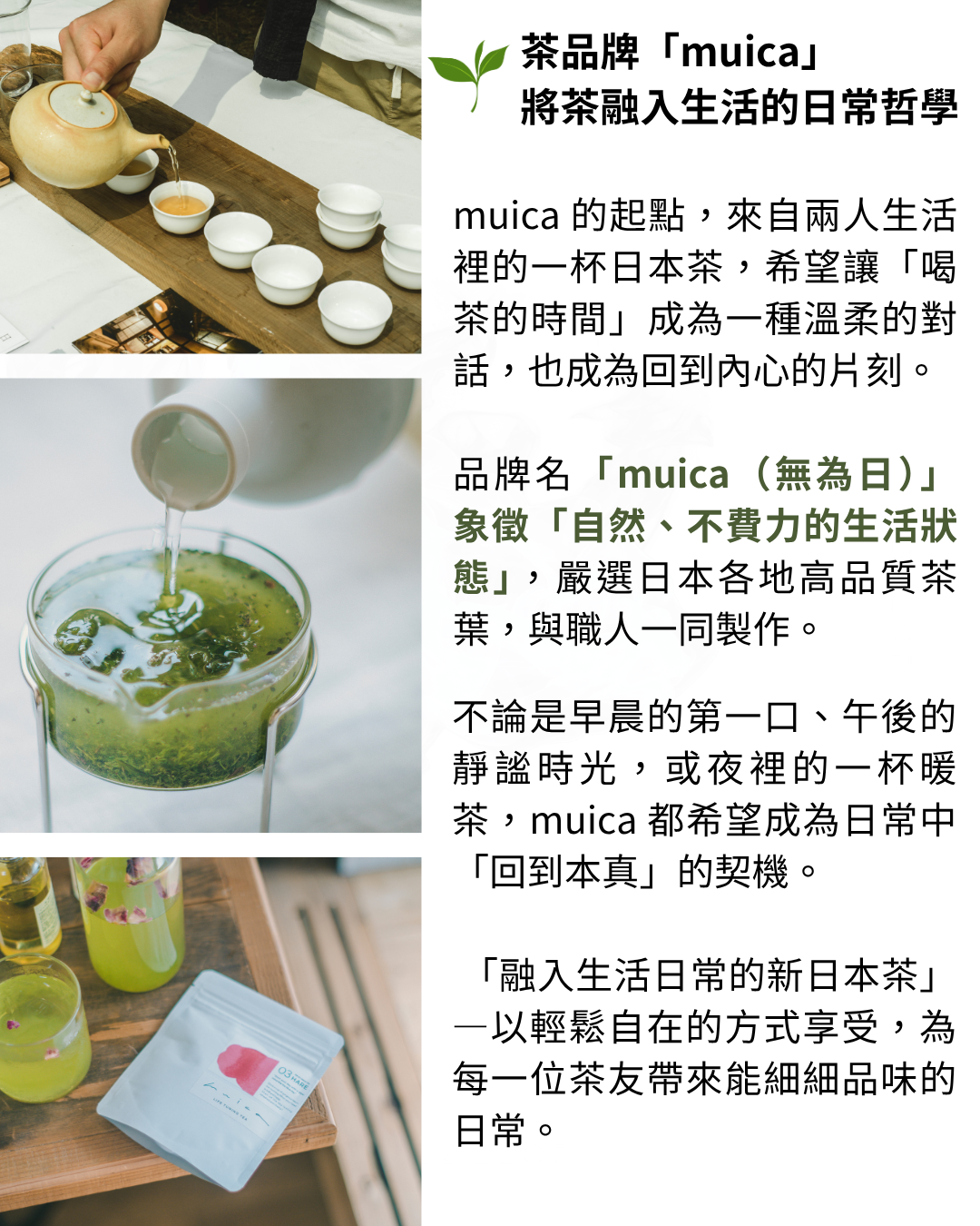 muica 的起點,來自兩人生活裡的一杯日本茶,希望讓「喝茶的時間」成為一種溫柔的對話,也成為回到內心的片刻,品牌名「muica(無為日)」象徵「自然、不費力的生活狀態」,嚴選日本各地高品質且稀有的茶葉,與職人一同製作。