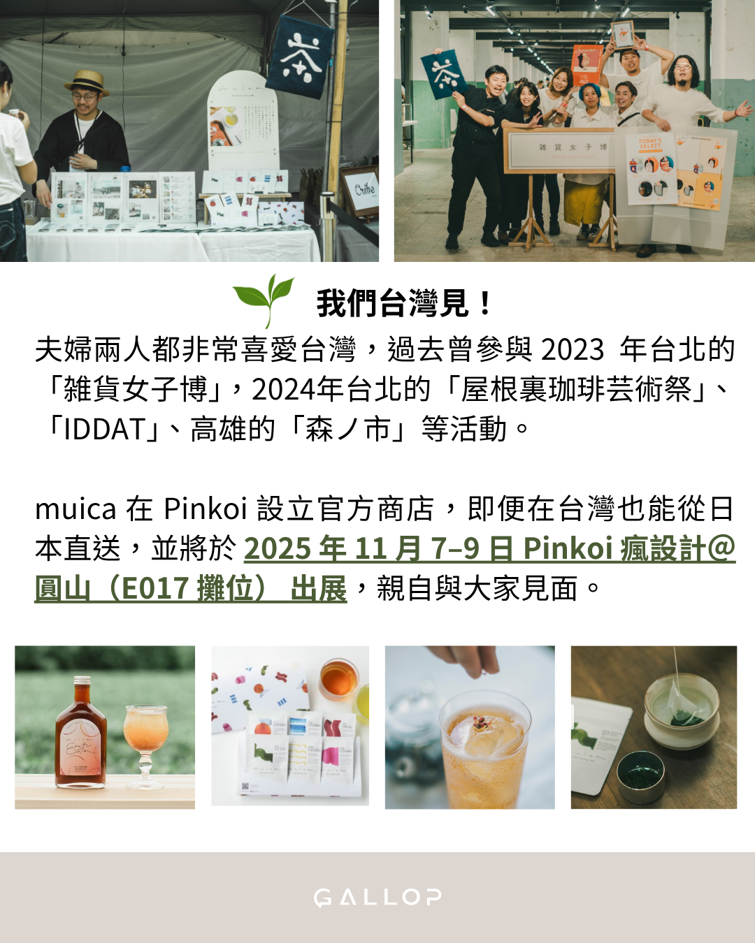 兩人都非常喜愛台灣,曾參與「雑貨女子博@台北」、「屋根裏珈琲芸術祭」、「森ノ市@高雄」等活動。 muica 也設立了 Pinkoi 官方商店,讓台灣的朋友能輕鬆購買,並將於 2025 年 11 月 7–9 日 Pinkoi 瘋設計@圓山(E017 攤位) 出展,親自與大家見面。