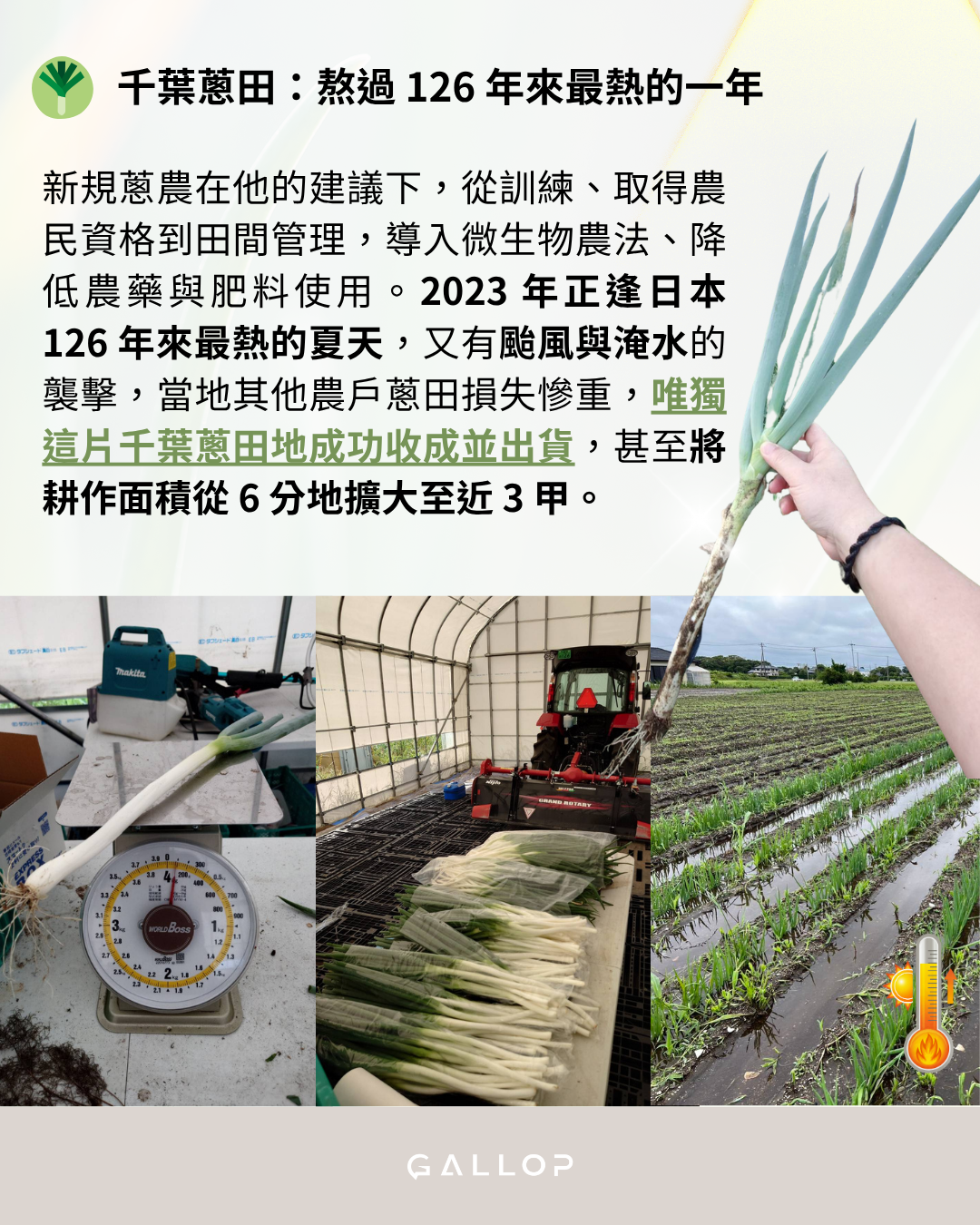 新規蔥農在他的建議下,從訓練、取得農民資格到田間管理,導入微生物農法、降低農藥與肥料使用。2023 年正逢日本 126 年來最熱的夏天,隨後又有颱⾵與淹水的襲擊,當地其他農戶蔥田損失慘重,唯獨這片千葉蔥田地成功收成並出貨,甚至將耕作面積從 6 分地擴大至近 3 甲。